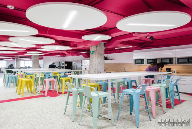 色彩各異的高獨凳符合辦公室的設(shè)計風格,頂部不同的“天空”色彩都在與主題相呼應。整體設(shè)計非常具有創(chuàng)意性,通過不同色彩的交替營造出不同的辦公環(huán)境。